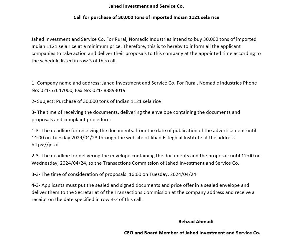 شرکت سرمایه گذاری و خدمات صنایع روستایی عشایری جاهد در نظر دارد مقدار 30.000 تن برنج 1121 سلا هندی وارداتی را با حداقل قیمت خرید نماید.لذا بدینوسیله به اطلاع کلیه شرکت هایی که تمایل به فروش دارند می رساند، مطابق برنامه زمانی مندرج در ردیف 3 این فراخوان نسبت به دریافت اسناد و شرایط فراخوان اقدام و پیشنهادات خود را در زمان مقرر به این شرکت تحویل نمایند.