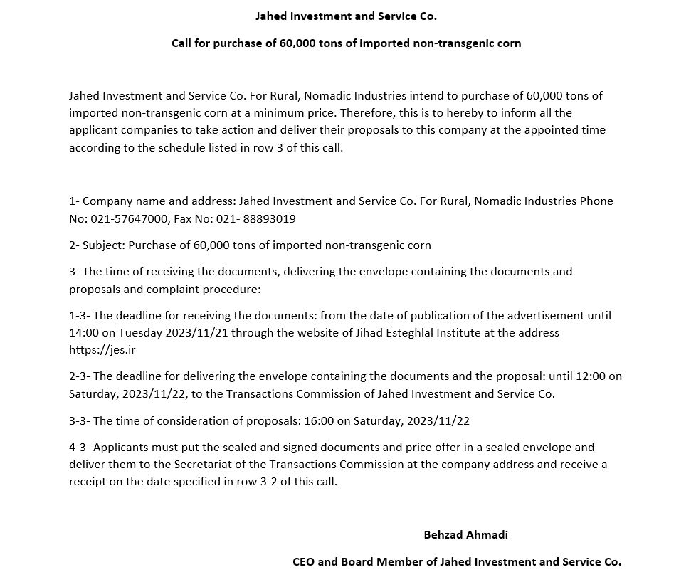 شرکت سرمایه گذاری و خدمات صنایع روستایی عشایری جاهد در نظر دارد مقدار 60.000 تن ذرت دامی غیرتراریخته وارداتی را با حداقل قیمت خرید نماید.لذا بدینوسیله به اطلاع کلیه شرکت هایی که تمایل به فروش دارند می رساند، مطابق برنامه زمانی مندرج در ردیف 3 این فراخوان نسبت به دریافت اسناد و شرایط فراخوان اقدام و پیشنهادات خود را در زمان مقرر به این شرکت تحویل نمایند.