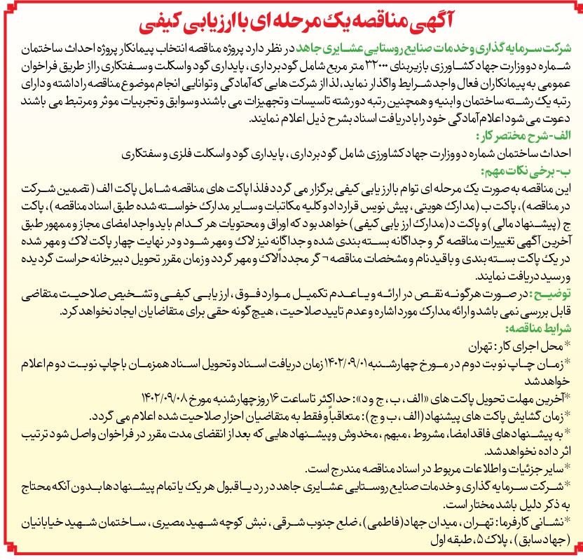 مناقصه انتخاب پیمانکار پروژه احداث ساختمان شماره 2 وزارت جهاد و کشاورزی با ارزیابی کیفی از طریق فراخوان عمومی برگزار می شود