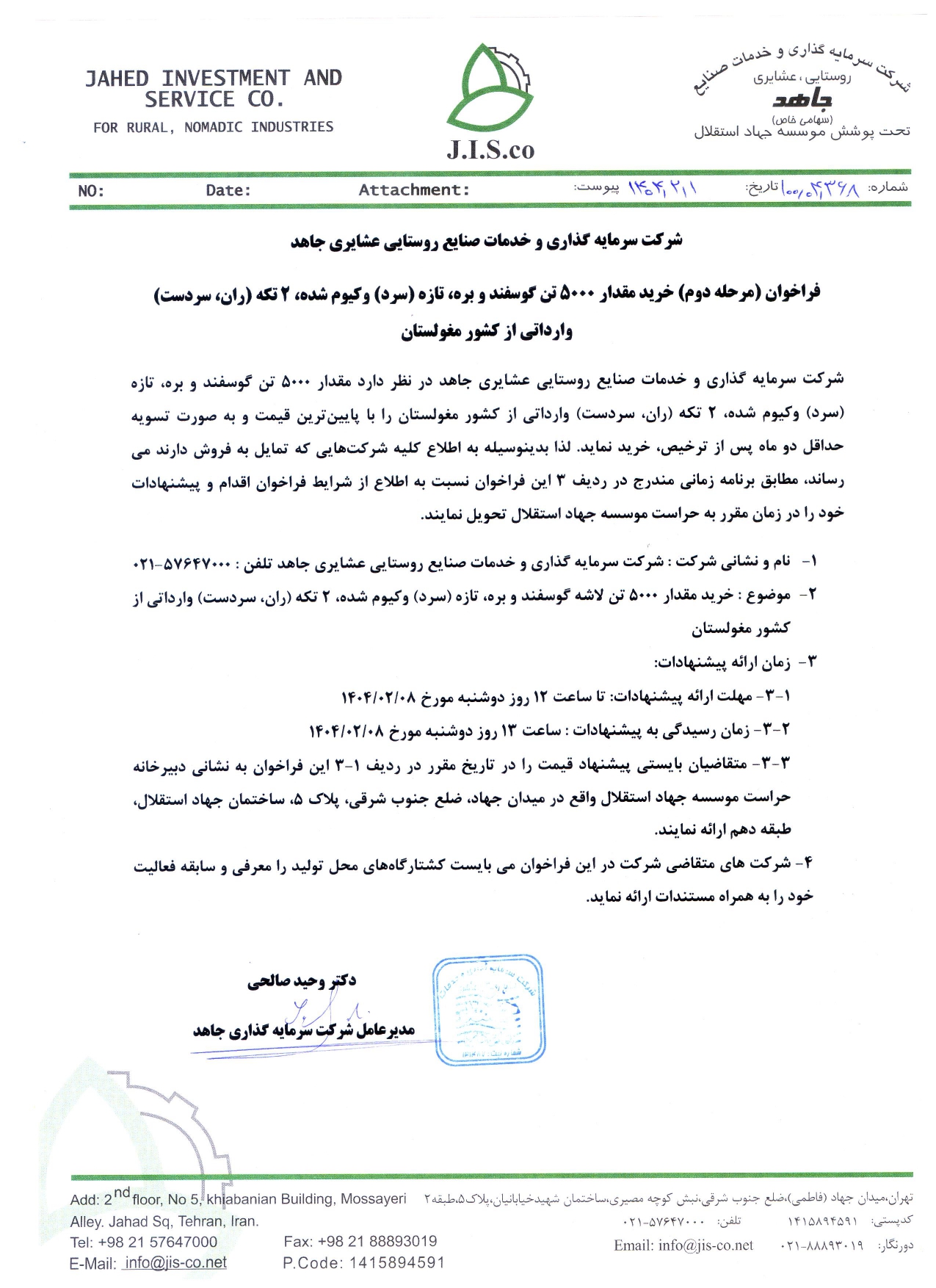 شرکت سرمایه گذاری و خدمات صنایع روستایی عشایری جاهد در نظر دارد مقدار 5000 تن گوسفند و بره، تازه (سرد) وکیوم شده، 2 تکه (ران، سردست) وارداتی از کشور مغولستان را با پایین‌ترین قیمت و به صورت تسویه حداقل دو ماه پس از ترخیص، خرید نماید. لذا بدینوسیله به اطلاع کلیه شرکت‌هایی که تمایل به فروش دارند می رساند، مطابق برنامه زمانی مندرج در ردیف 3 این فراخوان نسبت به اطلاع از شرایط فراخوان اقدام و پیشنهادات خود را در زمان مقرر به حراست موسسه جهاد استقلال تحویل نمایند.