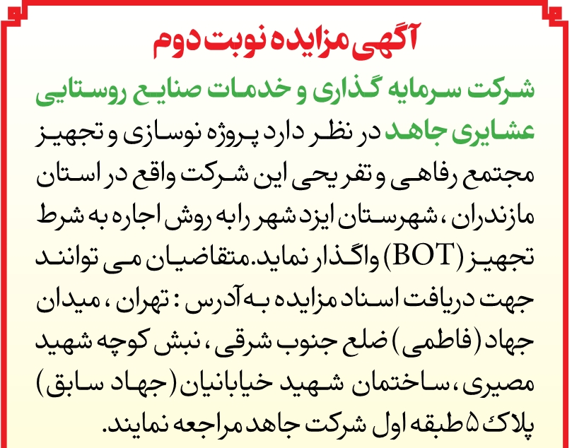 12 شهریور 1402 سرمایه گذاری و خدمات صنایع روستایی عشایری جاهد مناقصه و مزایده