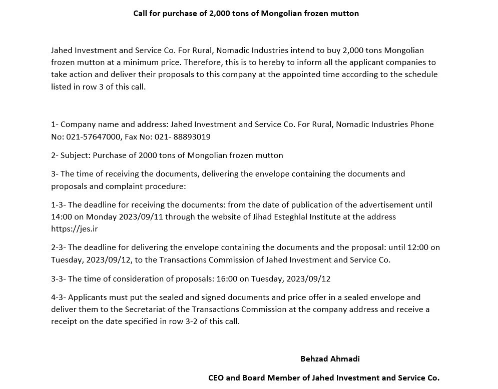 شرکت سرمایه گذاری و خدمات صنایع روستایی عشایری جاهد در نظر دارد مقدار 2000 تن گوشت گوشت گوسفندی منجمد مغولی وارداتی را با حداقل قیمت خرید نماید. لذا بدینوسیله به اطلاع کلیه شرکت هایی که تمایل به فروش دارند می رساند، مطابق برنامه زمانی مندرج در ردیف 3 این فراخوان نسبت به دریافت اسناد و شرایط فراخوان اقدام و پیشنهادات خود را در زمان مقرر به این شرکت تحویل نمایند.